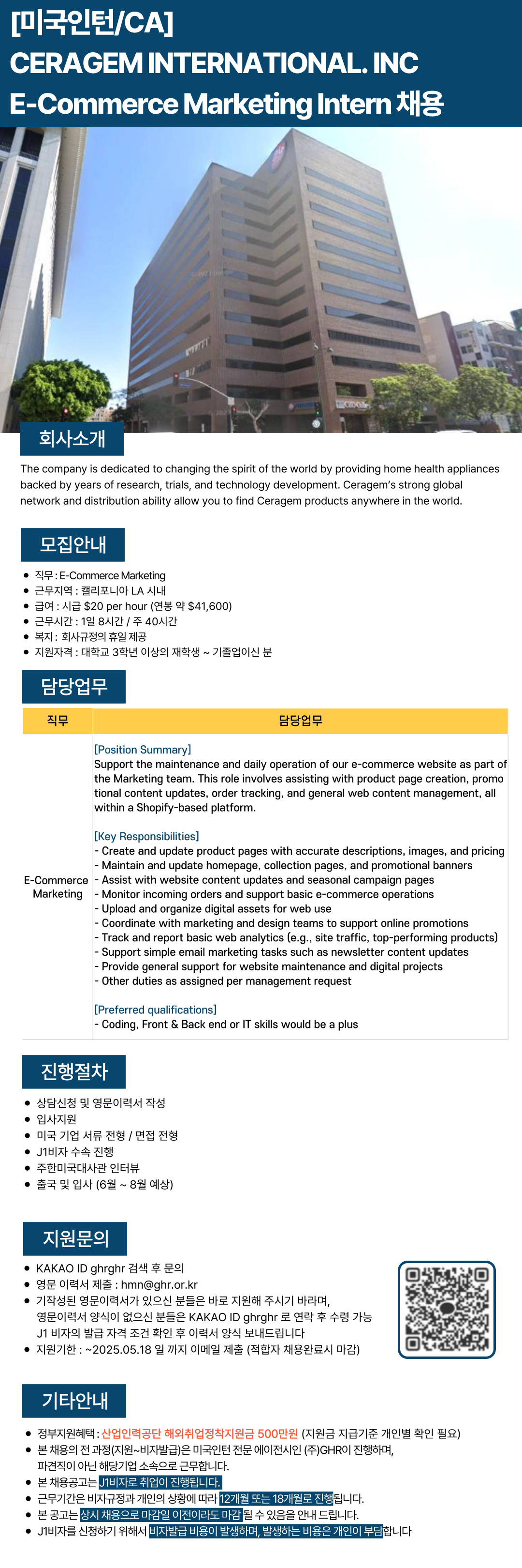 [미국인턴/CA]CERAGEM INTERNATIONAL. INCE-Commerce Marketing Intern 채용 (~5,18)