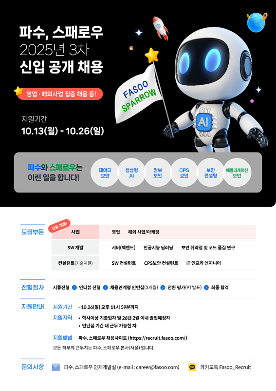 ■ 파수, 스패로우 - 2025년 3차 신입 공개 채용1. 모집 형태: 채용연계형 인턴(신입)