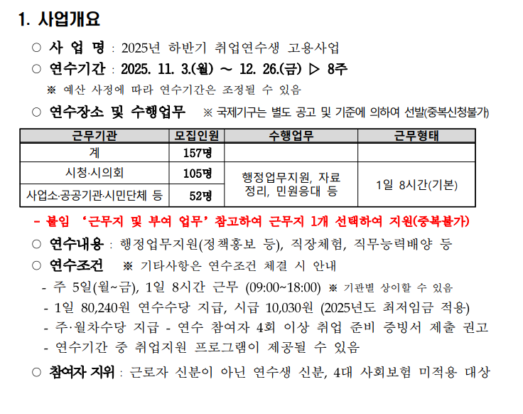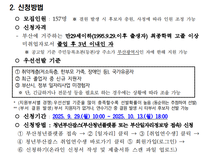 우리 시에서는 부산광역시 거주 미취업 청년을 대상으로 공공기관 등에서 일정기간의 취업연수 활동을 통한 행정체험 및 취업지원을 위해 다음과 같이『2025년 하반기 취업연수생』을 모집하오니 참여를 희망하는 대상자는 신청 바랍니다.