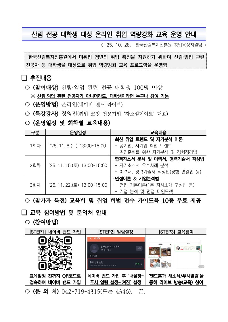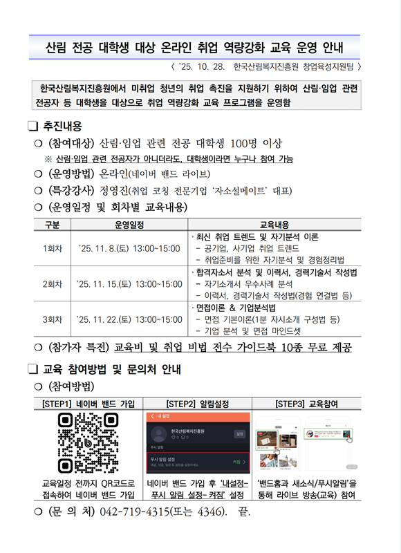 모집중산림 전공 대학생 대상 온라인 취업 역량강화 교육 운영 안내