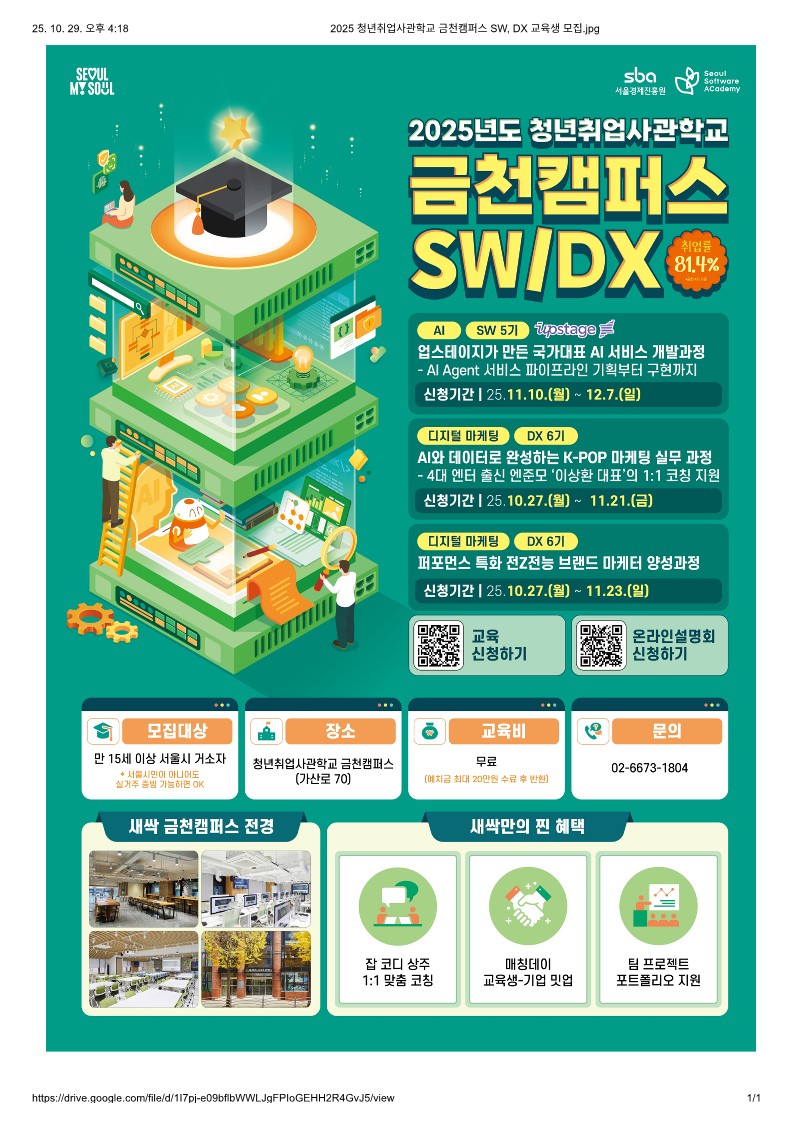 [청년취업사관학교 금천캠퍼스 SW/DX 교육생 모집]