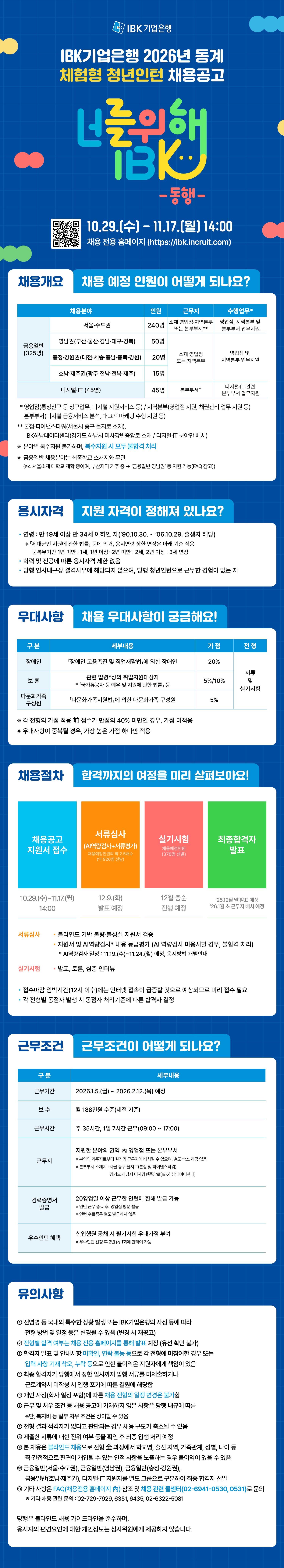 모집중[IBK기업은행] 2026년 동계 체험형 청년인턴 공개채용 (~11/17, 14:00)