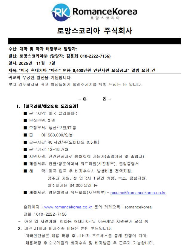 2025년 미국 아진산업 모집공고(2026년 1-2월 출국예정),