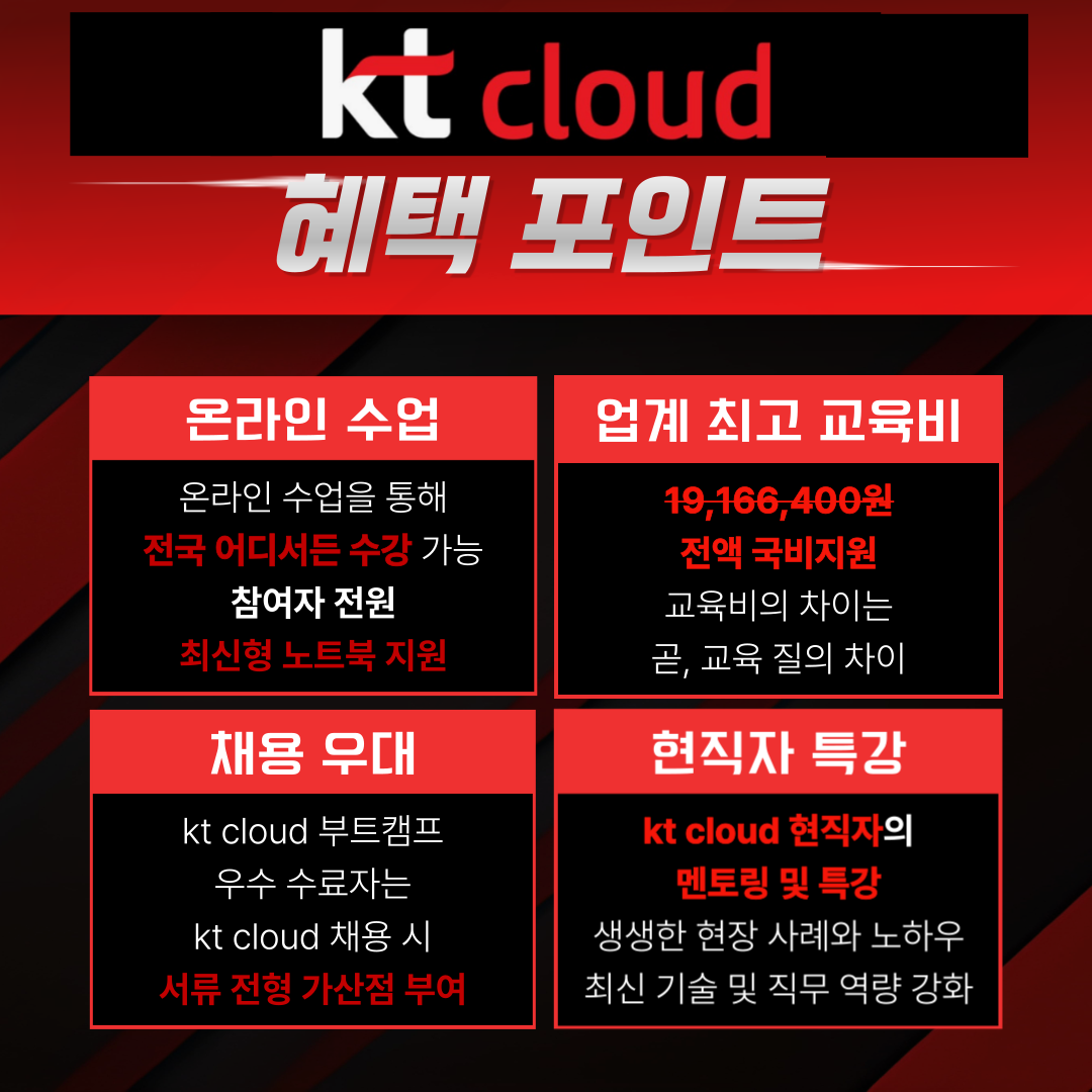 kt cloud 온라인 부트캠프 실시간 비대면 강의, 우수수료생 kt cloud 채용 시 서류전형 가산점 부여 혜택