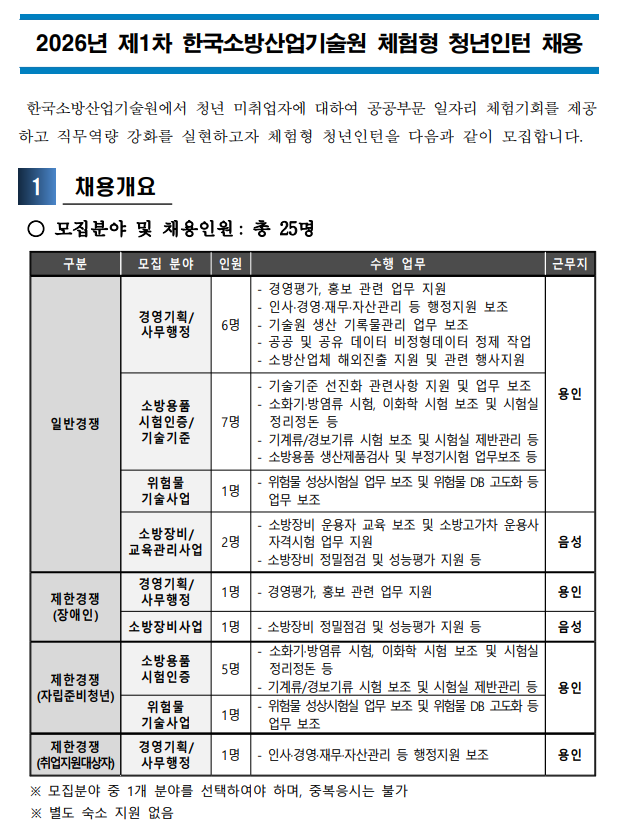한국소방산업기술원 2026년 제1차 체험형 청년인턴 채용