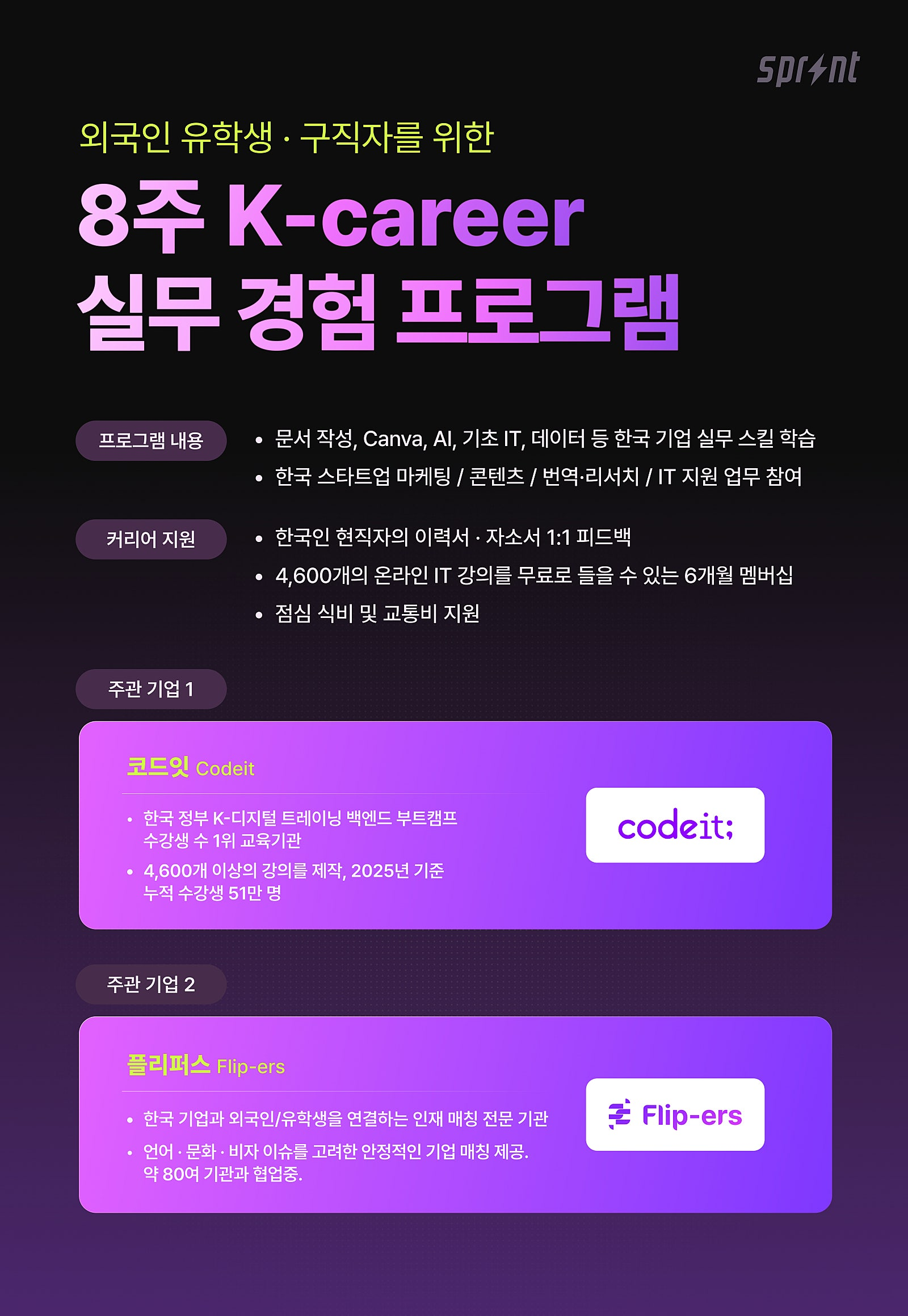 - 프로그램명: K-career (외국인 유학생 대상 한국 취업 준비 프로그램)