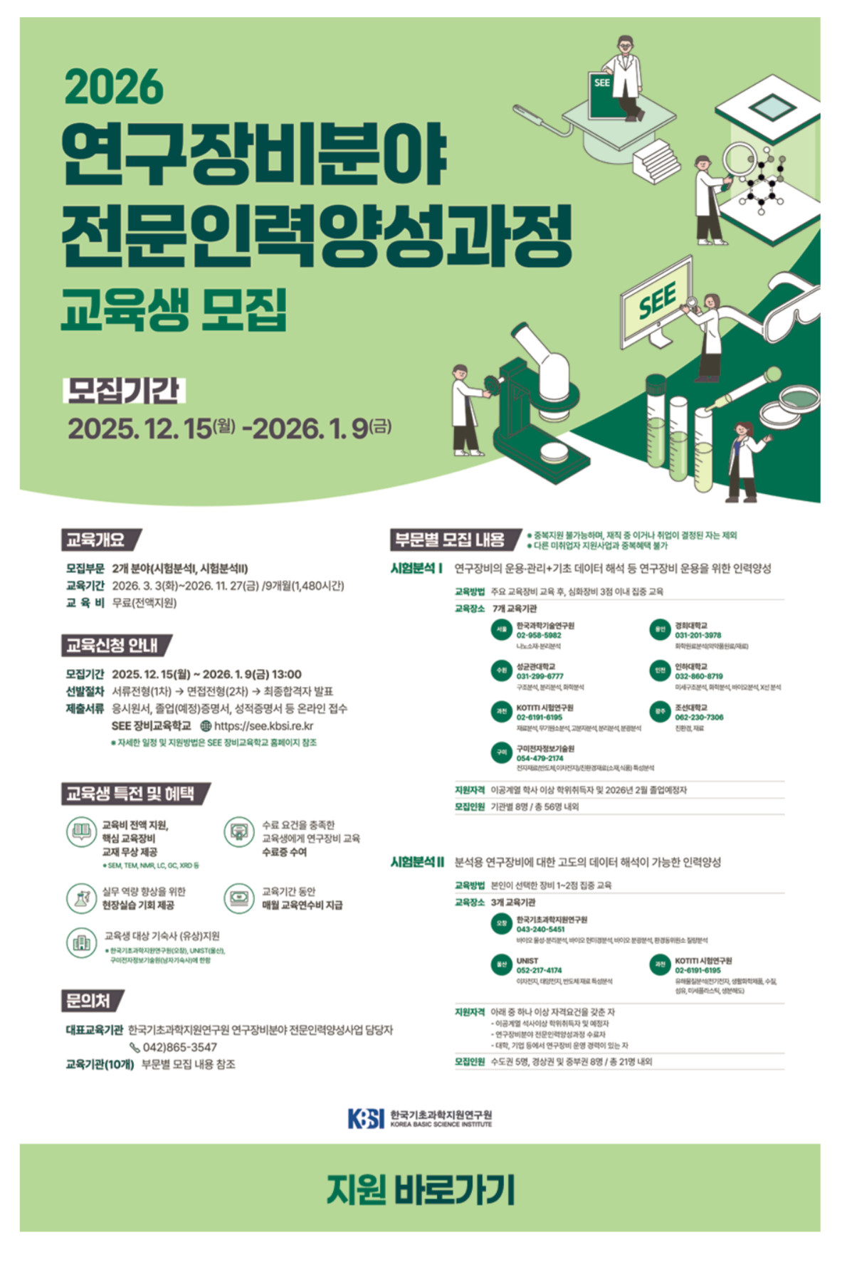 · 2026년 연구장비분야 전문인력 양성과정 교육생 모집 · 학력 : 무관 · 마감일 : 2026.01.09 · URL : https://job.incruit.com/jobdb_info/jobpost.asp?job=2512110001736