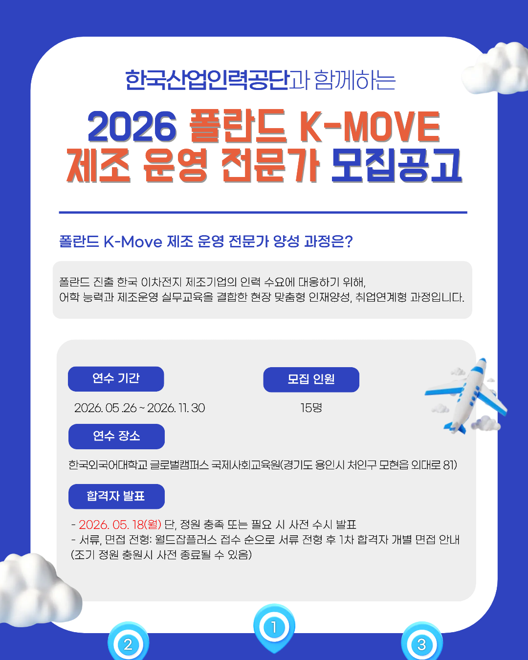 • 목표 : 폴란드 진출 한국 이차전지 제조기업의 인력 수요에 대응하기 위해 어학 능력을 기반으로 제조운영 실무교육을 결합한 현장 맞춤형 인재 양성, 취업연계형 과정입니다
