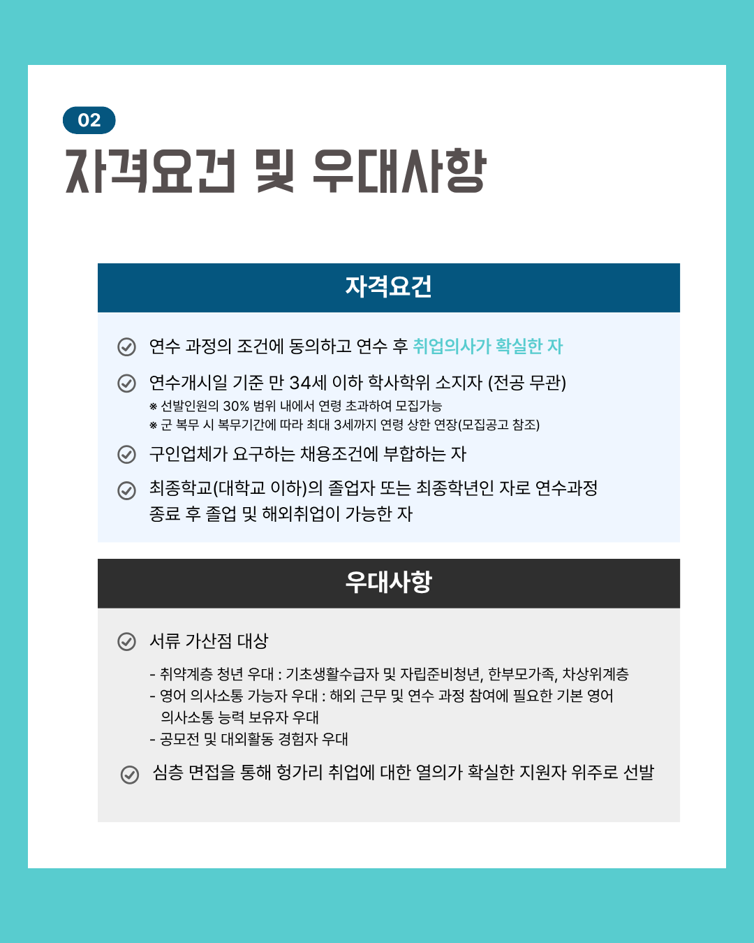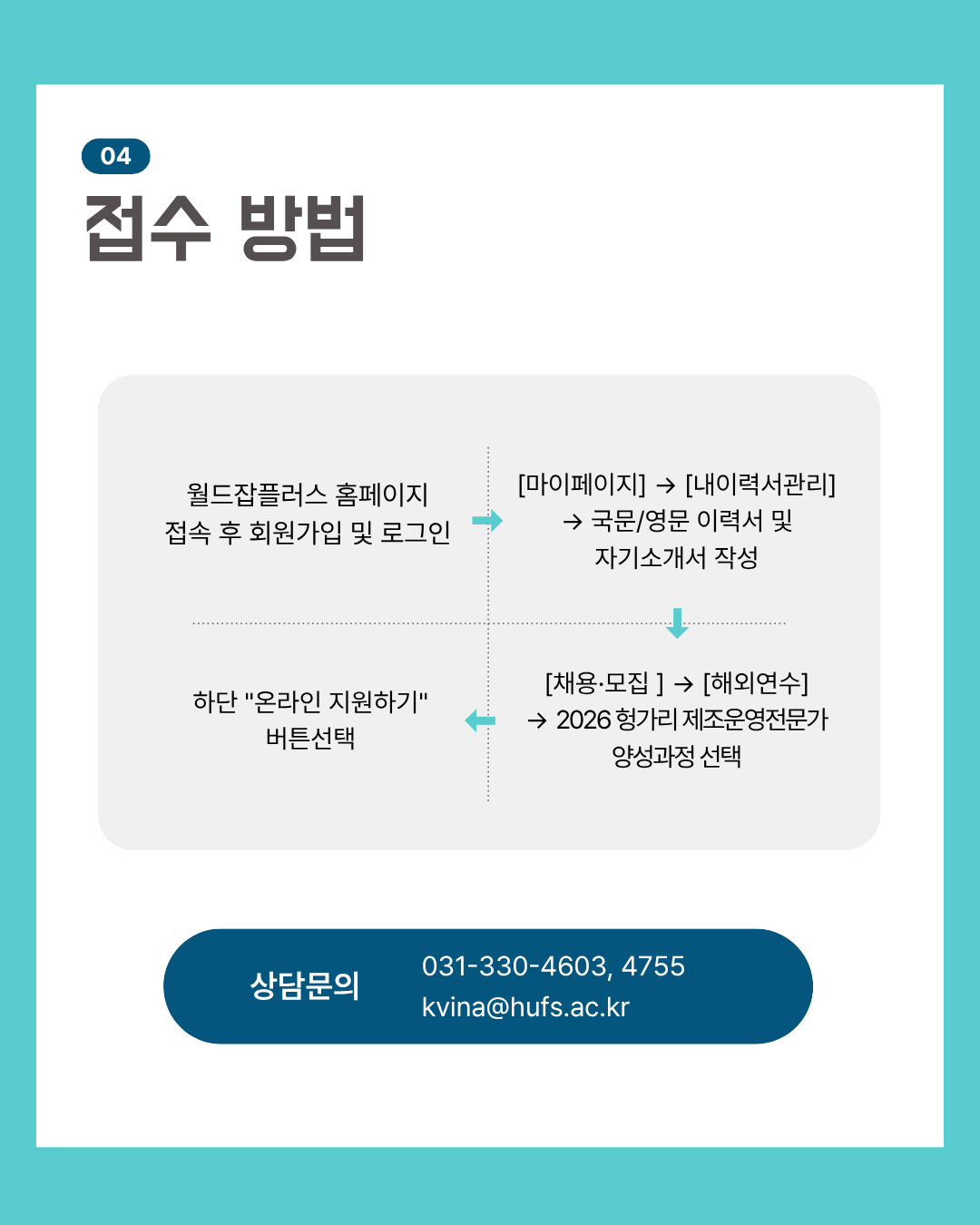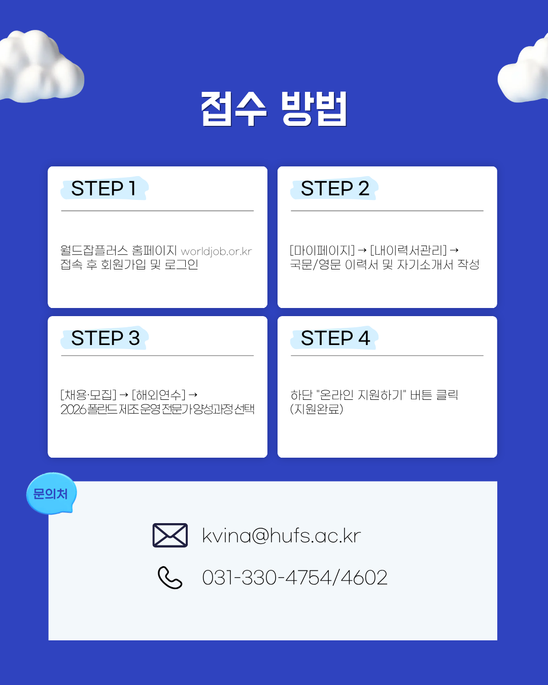 • 서류, 면접 전형 : 월드잡플러스 접수 순으로 서류 전형 후 1차 합격자 개별 면접 안내 / 조기 정원 충원시 사전 종료될 수 있음