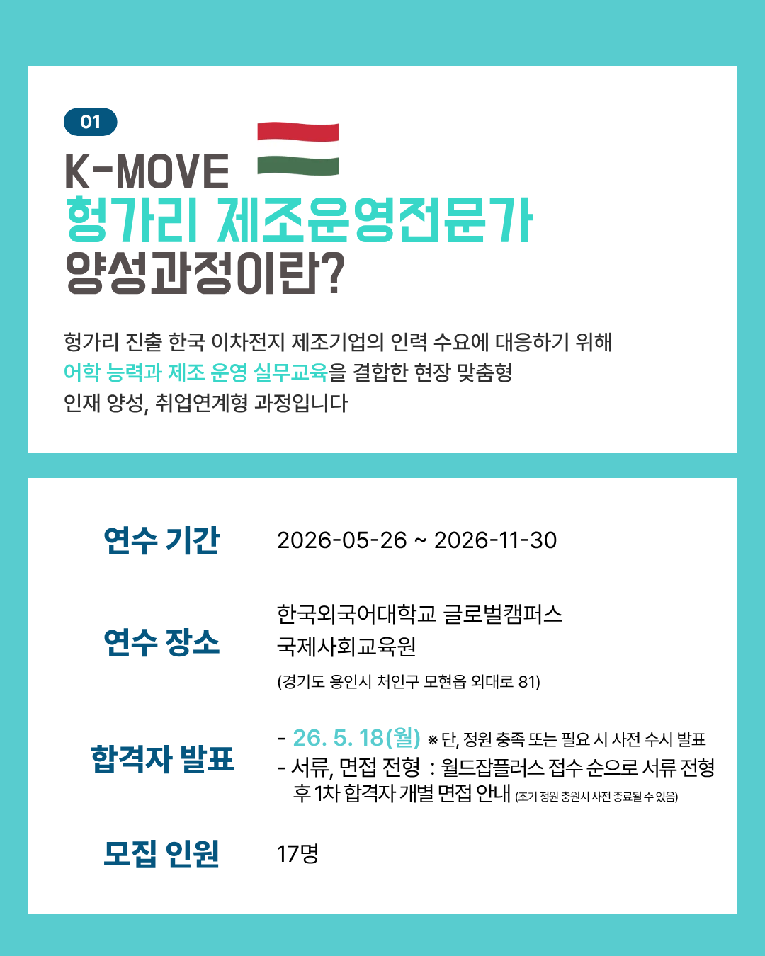 • 목표 : 헝가리 진출 한국 이차전지 제조기업의 인력 수요에 대응하기 위해 어학 능력을 기반으로 제조운영 실무교육을 결합한 현장 맞춤형 인재 양성, 취업연계형 과정입니다
