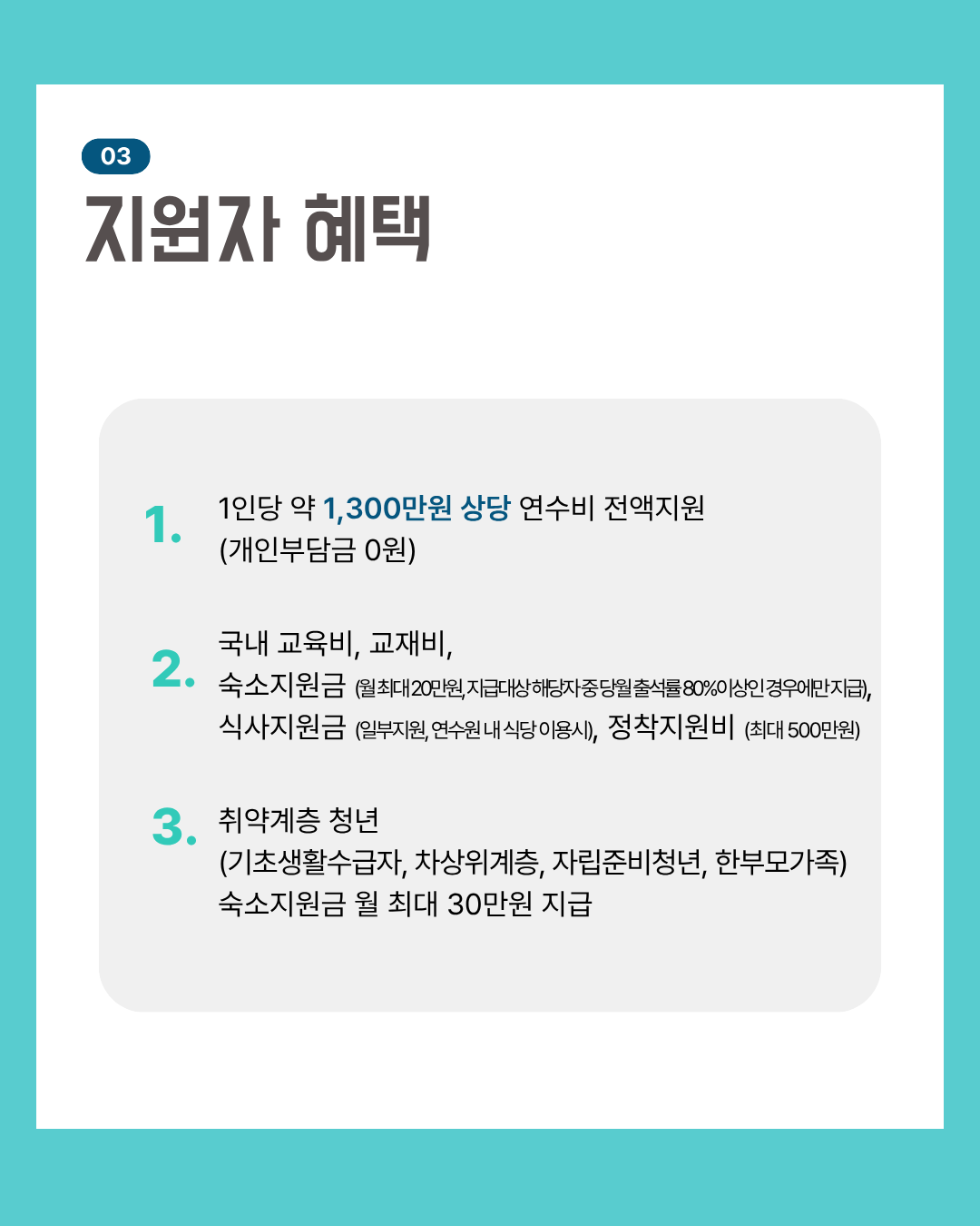 • 지원사항 : 1인당 약 1,300만원 상당 연수비 전액지원(개인부담금 0원), 국내 교육비, 교재비, 숙소지원금(월 최대 20만원, 지급대상 해당자 중 당월 출석률 80% 이상인 경우에만 지급), 식사지원금(일부지원, 연수원 내 식당 이용시), 정착지원비(최대 500만원) 등