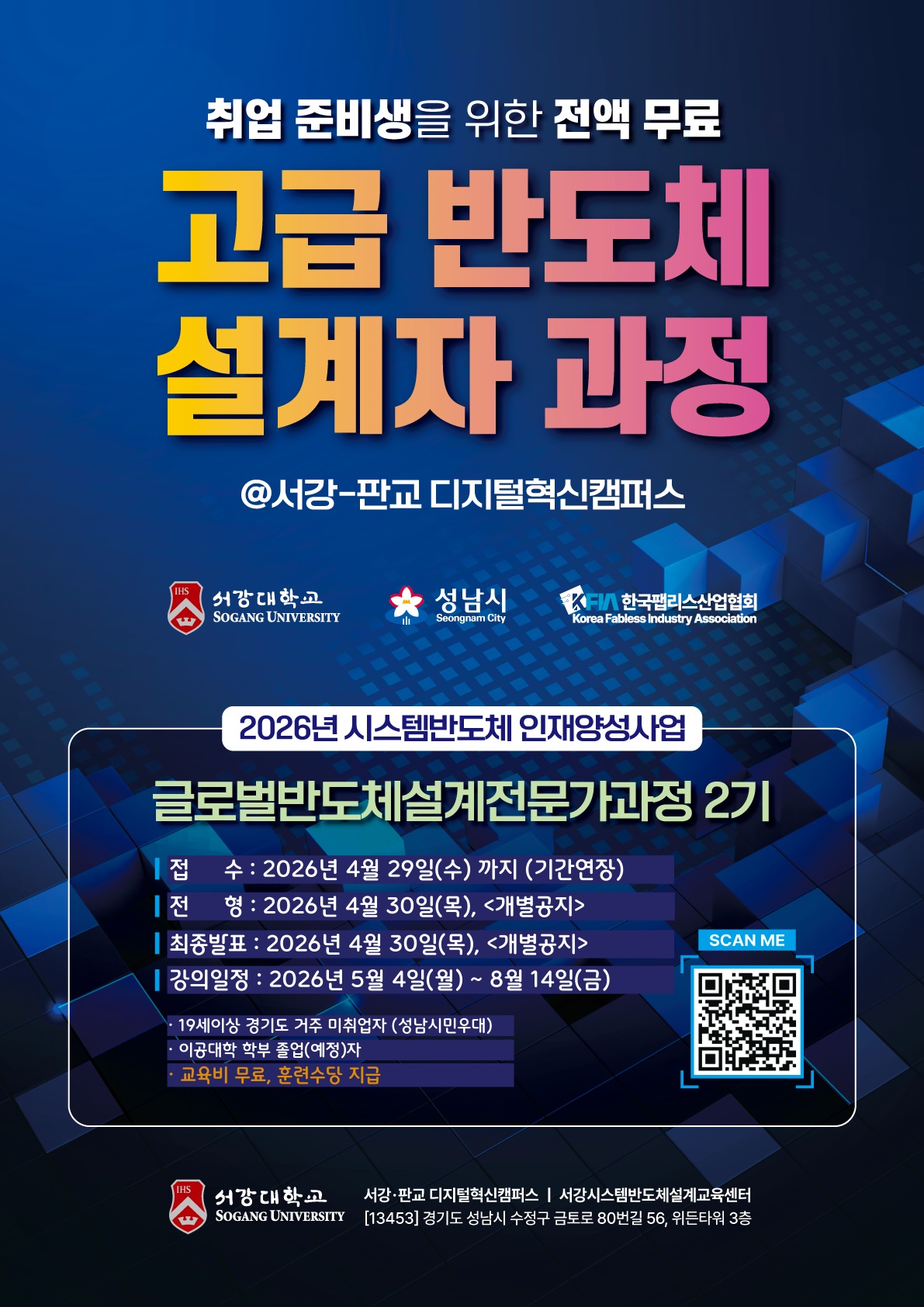 서강대학교 판교 디지털혁신캠퍼스는 ‘성남시 시스템 반도체 인재양성사업’을 통해 국내 팹리스 기업 현장에서 바로 활약할 수 있는 실무형 고급 인력을 육성합니다. 본 교육 과정은 반도체 설계 분야의 입문 과정을 넘어 advanced course로 기획되어 최고 경력의 교수진에 의한 9주간의 설계 기술 강의와 6주간의 팀 프로젝트를 통하여 실무 역량을 강화하고 협업과 소통 능력 및 문제 해결 능력을 갖춘 반도체 설계의 리더급 전문가로 성장할 수 있습니다.