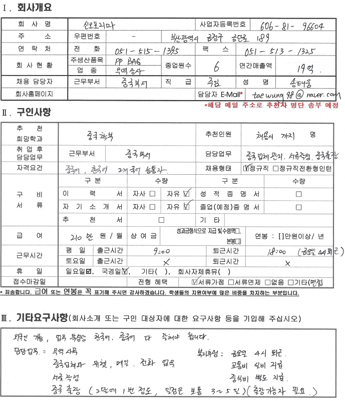 - 추천채용 공고는 반드시 아래 「추천채용 의뢰서」 양식을 포함하여 취업전략과 메일로 보내주시기 바랍니다.