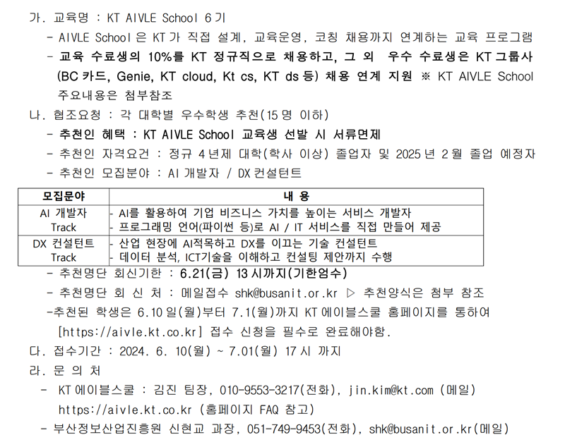 KT AIVLE School 6기 모집 안내(교육생 추천)