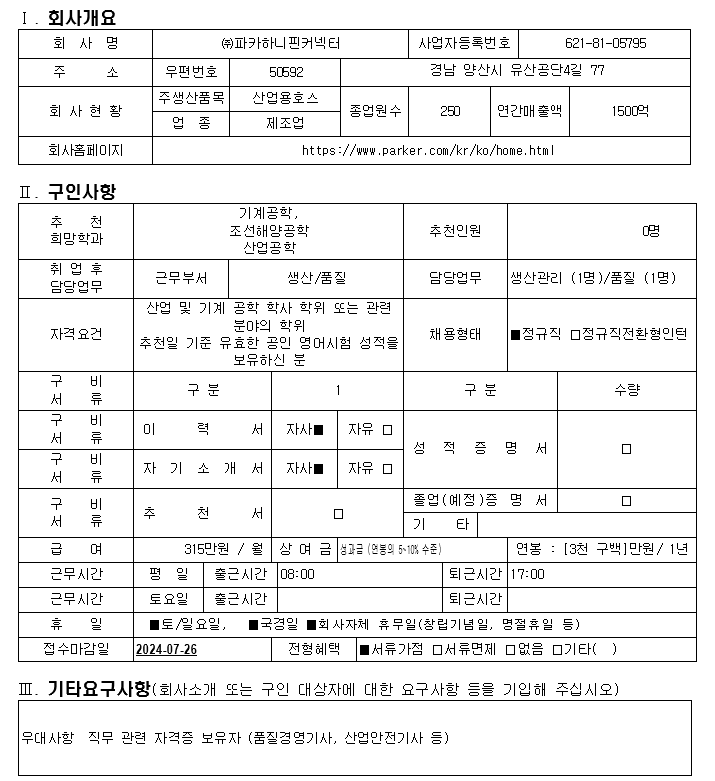 ㈜파카하니핀커넥터 추천채용 안내(생산/품질)