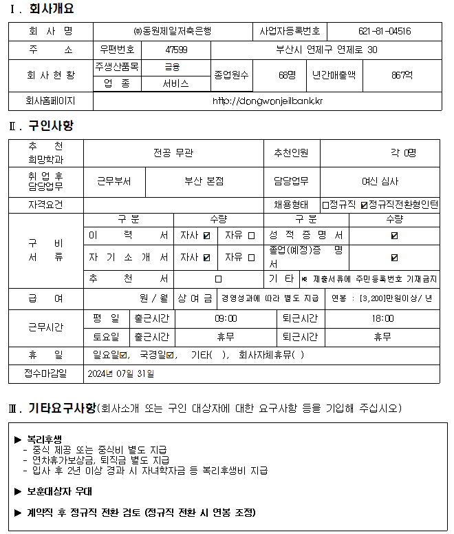 ㈜동원제일저축은행 추천채용 안내