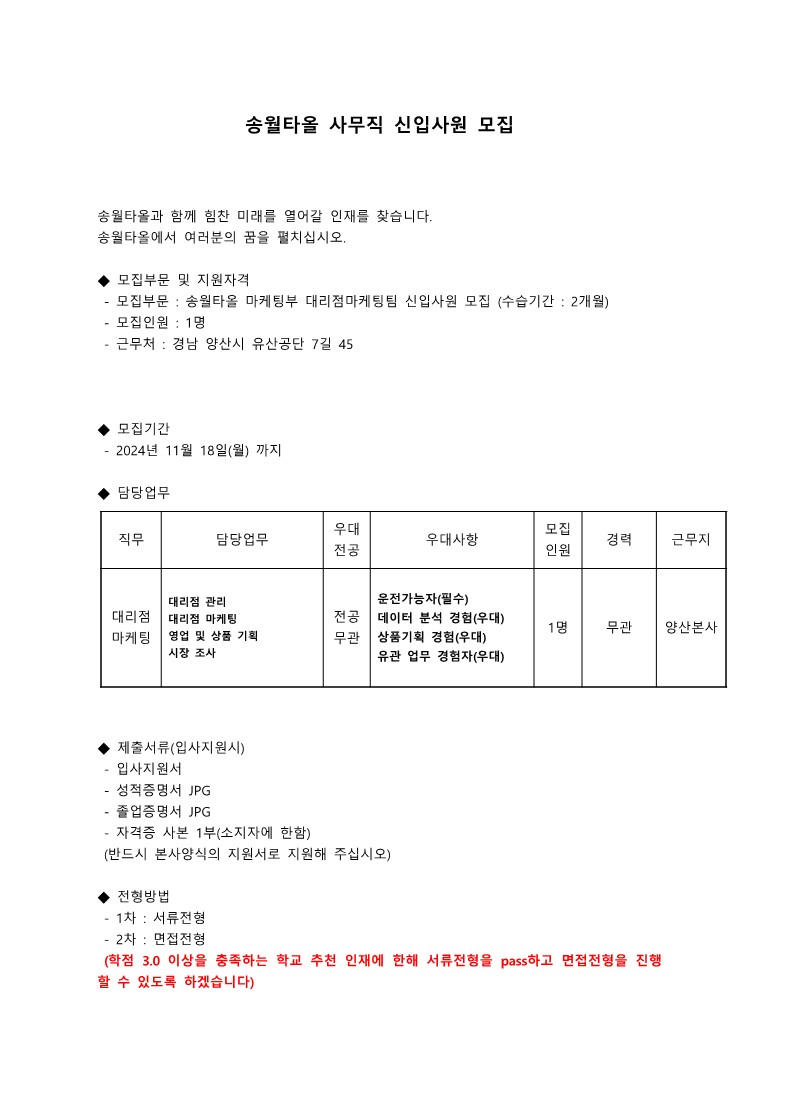 송월타올 추천채용 안내