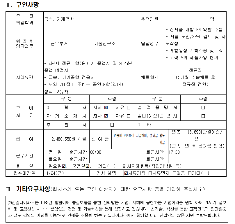 ※ 입사지원 관련 문의 : 카카오톡 채널 "선일다이파스 채용"