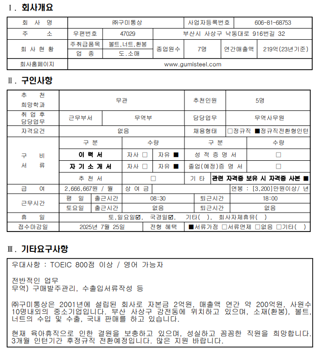 (주)구미통상 추천채용 안내