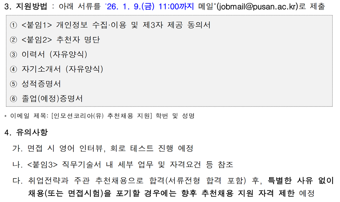 - 추천채용 공고는 반드시 아래 「추천채용 의뢰서」 양식을 포함하여 취업전략과 메일로 보내주시기 바랍니다.