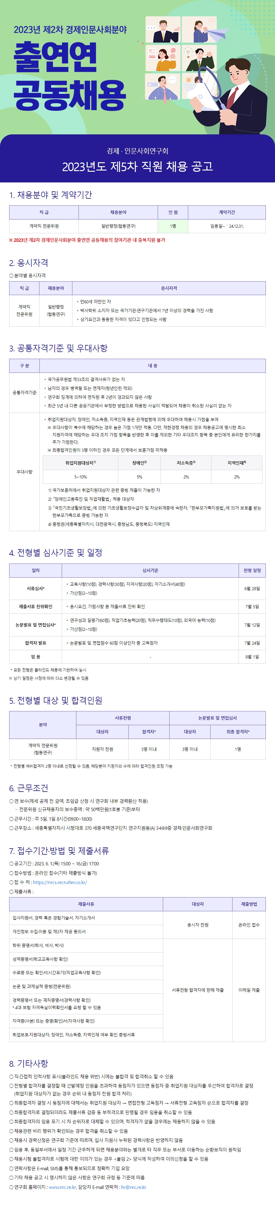 경제인문사회연구회에서 제5차 직원을 채용하고 있으니 관심 있는 분들의 많은 지원 바랍니다.