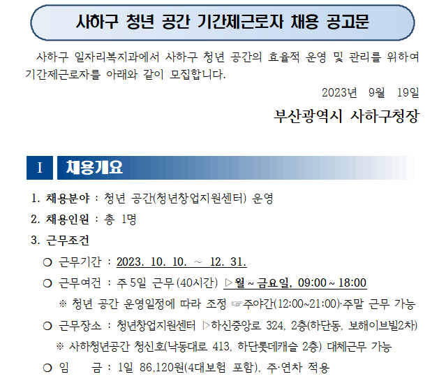 가. 채용분야 : 사하구 청년 공간 운영