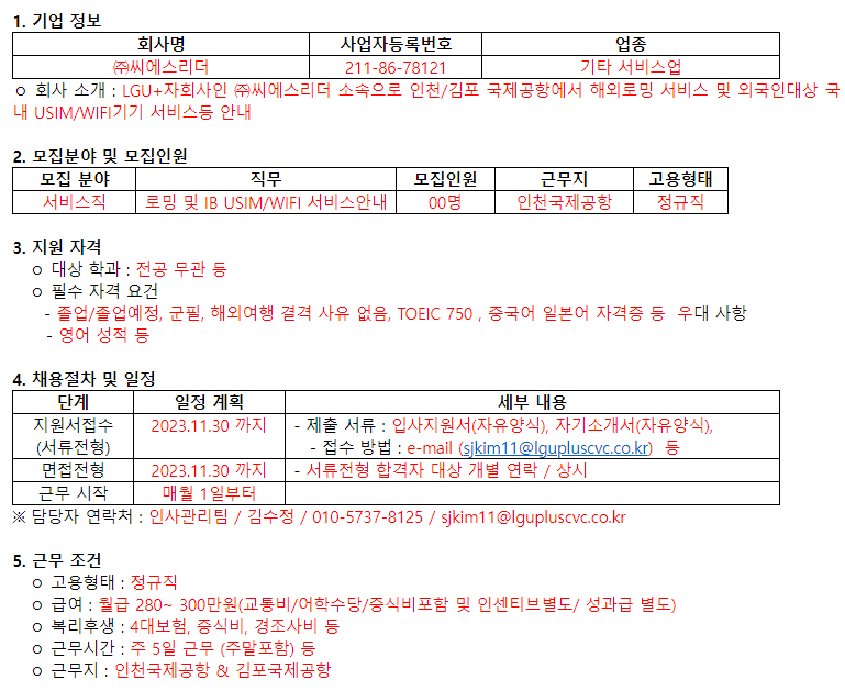 LGU+인천공항 로밍센터 로밍 및 IB USIM/WIFI 서비스안내 담당 채용