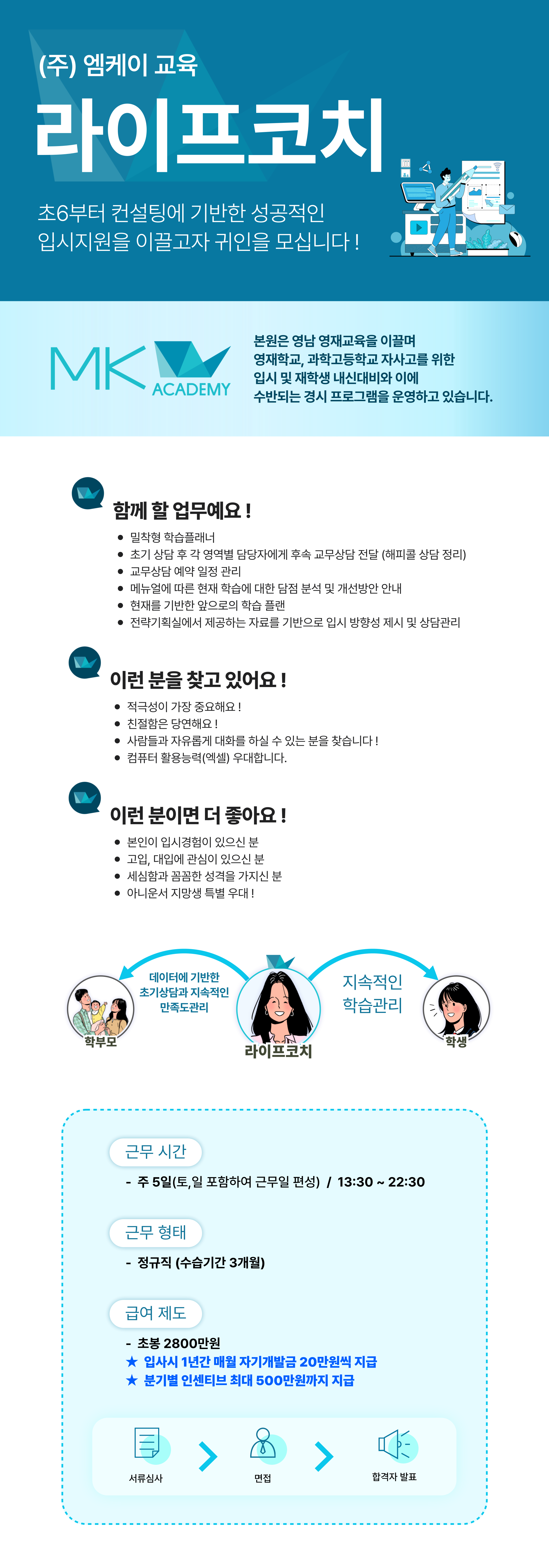 [ 엠케이 아카데미에서 라이프 코칭 업무를 담당하실 전문가를 모십니다.]