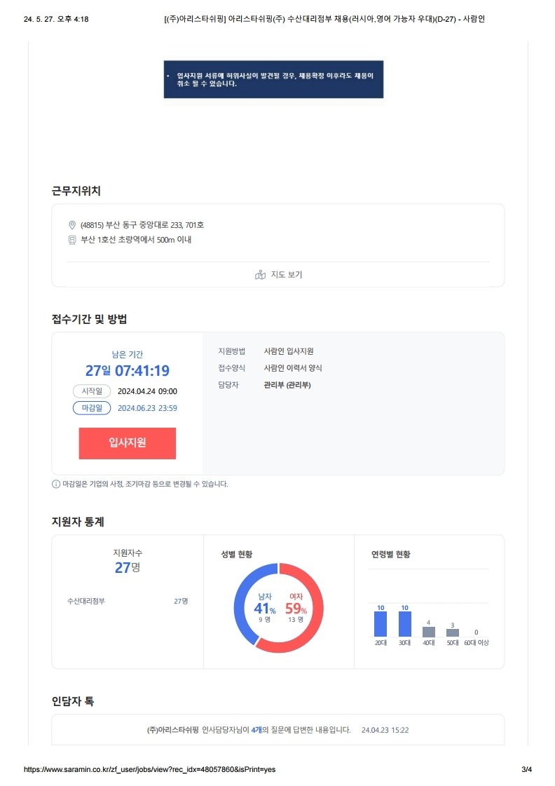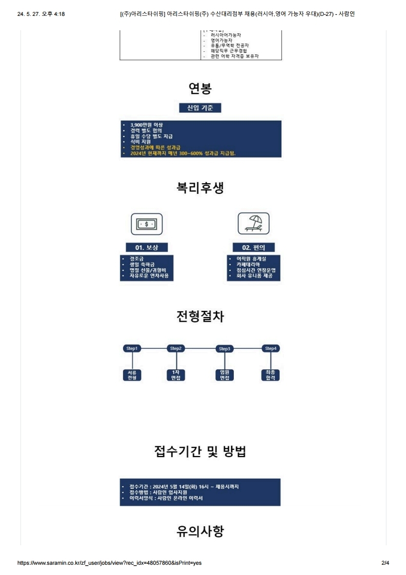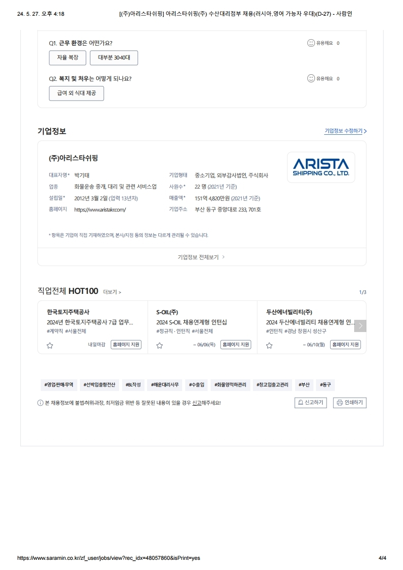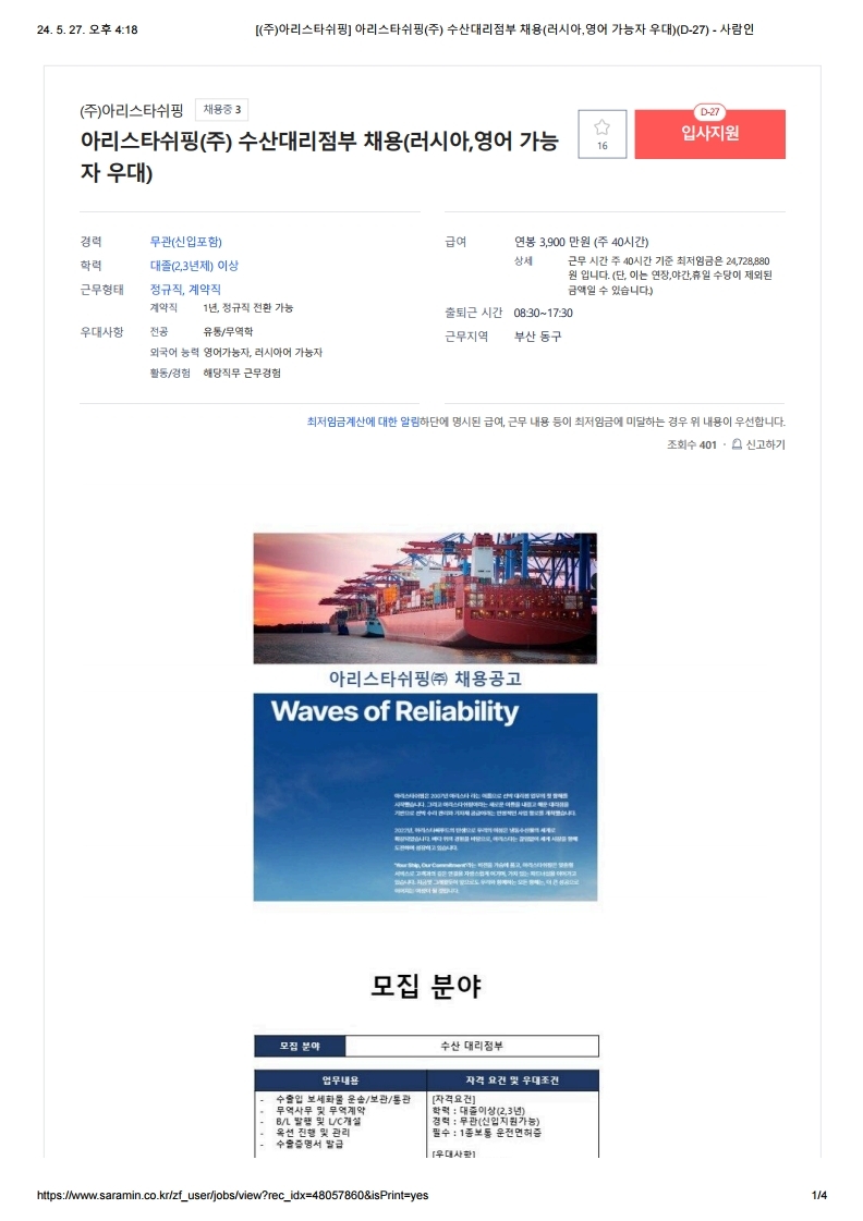 (주)아리스타쉬핑 수산대리점부 채용 공고(러시아,영어 가능자 우대)