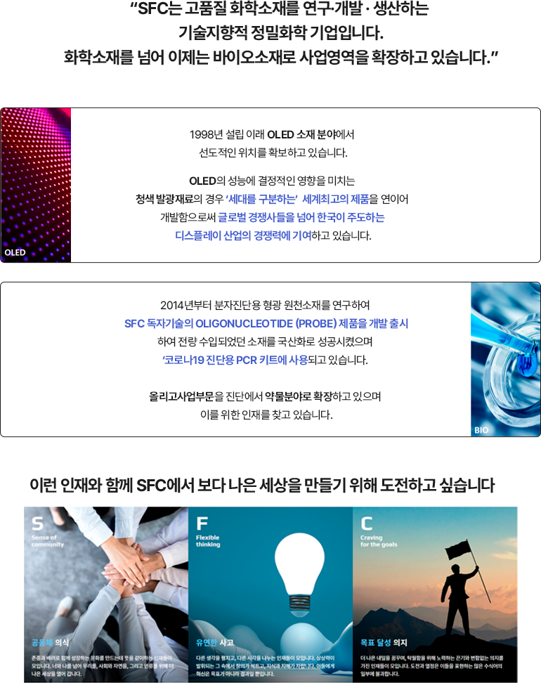 ㆍ문의처 : 인사담당자 (jykim4@sfc-dye.com) 메일, (043-280-9518) 전화 또는 홈페이지 채용 문의 이용홈페이지 지원