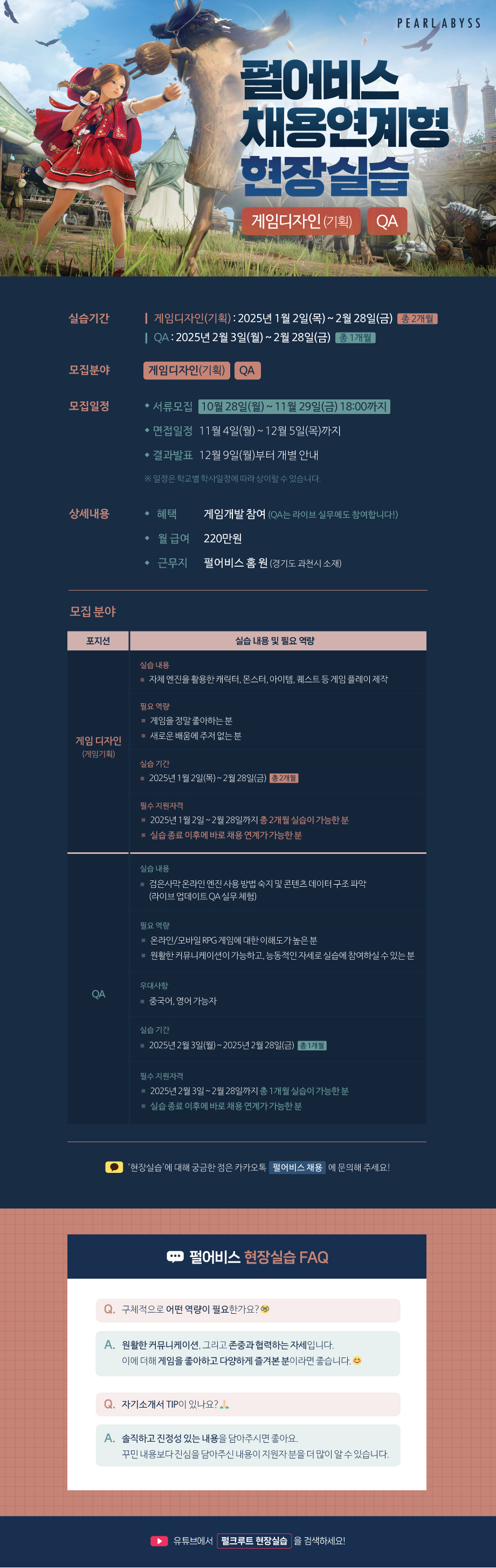 ■ 모집 직무 - 펄어비스 : 게임기획, QA - PA아트센터 : 게임 모델링, 애니메이션 ■ 서류 모집 기간 : 10. 28(월) ~ 11. 29(금) 18:00 까지 ■ 면접 기간 : 11. 4(월) ~ 12. 5(목)까지 ■ 현장실습 기간 (1) 게임기획 (2개월) : 2025. 1. 2(목) ~ 2025. 2. 28(금), 근무 시간 10:00-19:00 (2) QA (1개월) : 2025. 2. 3(월) ~ 2025. 2. 28(금), 근무 시간 10:00-19:00 (3) 게임 모델링, 애니메이션 (6개월) : 2025. 1. 2(월) ~ 2025. 6. 20(금), 근무 시간 10:00-19:00 *모델링/애니메이션의 경우 계절학기 기간 1차 평가 후, 합격한 인원들에 한해 1학기 현장실습이 진행됩니다. *자세한 일정은 학교 학사일정에 따라 변경될 수 있습니다. ■ 근무 장소 게임기획, QA - 펄어비스 홈 원 게임 모델링, 애니메이션 - PA아트센터 ■ 모집 분야 [모델러] - 실습 내용 : 게임 개발 및 프로젝트 콘셉트에 맞는 3D모델링 리소스 제작
