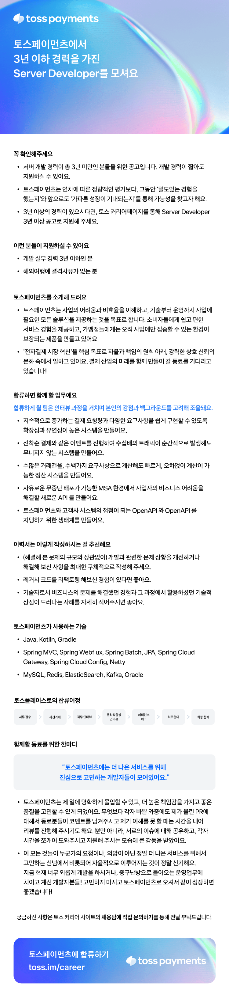- 지원 링크: https://toss.im/career/job-detail?job_id=4071141003&&utm_source=univ_careerpage&utm_medium=post&utm_campaign=22411_server