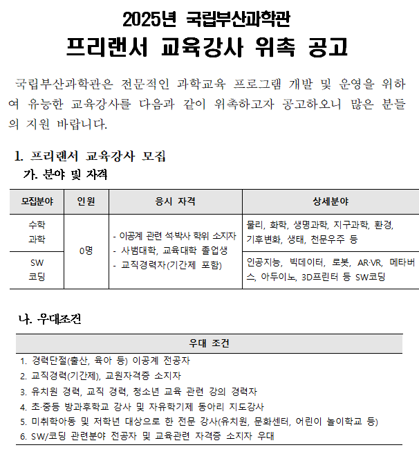 2025년 국립부산과학관 프리랜서 교육강사 위촉 공고