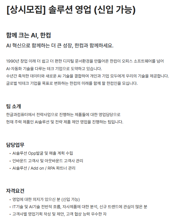 모집중한글과컴퓨터 솔루션영업 직군 신입사원 채용 안내