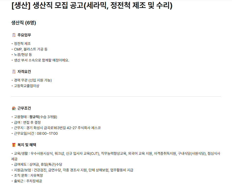 생산직/ 품질 검사원 채용 공고(세라믹,정전척 제조)_경기도 화성시 금곡동(동탄)