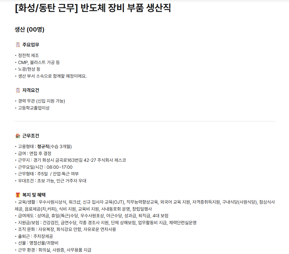 구분 내용 회사명 제스코(JESCO) 회사소개 반도체 핵심부품 수리 및 제조 전문 기업 근무지 경기도 화성시 금곡로 163번길 42-27 채용인원 생산팀 / 품질팀 모집분야 생산, 품질 지원자격 신입/경력 무관 (관련 전공자 우대, 영어 가능자 우대) 근무형태 정규직 (수습 3개월 후 전환) 급여 및 복리후생 면접 후 협의, 숙소 지원비 월 20만원 지급, 기숙사 제공, 4대보험, 퇴직금, 중식/석식 지원 전형절차 ① 서류 전형 → ② 1차 면접 (예정: 10월 14일, 화요일 / 일정 조율 가능) → ③ 최종 합격 지원방법 - 자유양식 이력서 및 자기소개서 제출 - 또는 사람인 채용공고를 통한 지원 가능 문의처 제스코 경영지원부 손성준 과장 ☎ 031-376-9828 / ✉ sjson@j-esco.com 공고 링크
