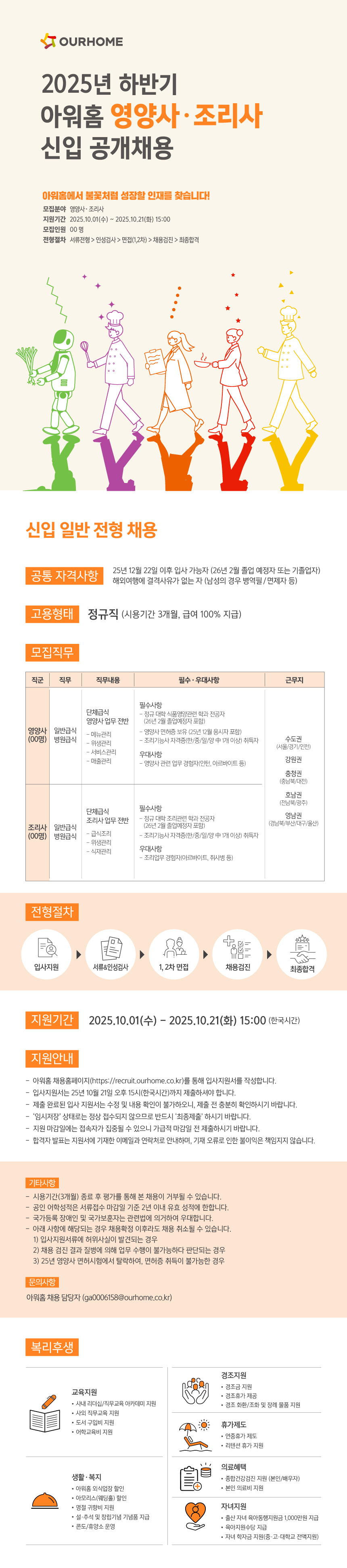 [아워홈] 2025년 영양사/조리사 신입 공개채용(~10/21)