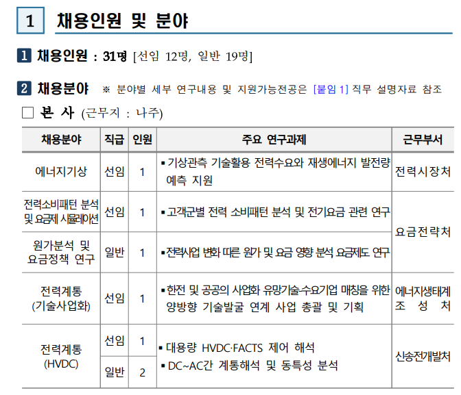 한전 2025년 연구직 채용 공고