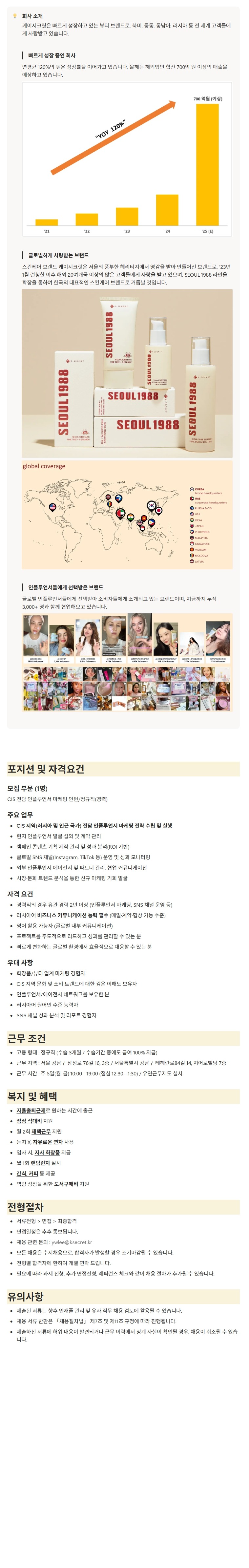 2. 케이시크릿 마케팅팀 CIS 전담 인플루언서 마케팅 (러시아어) 신입/경력직 채용