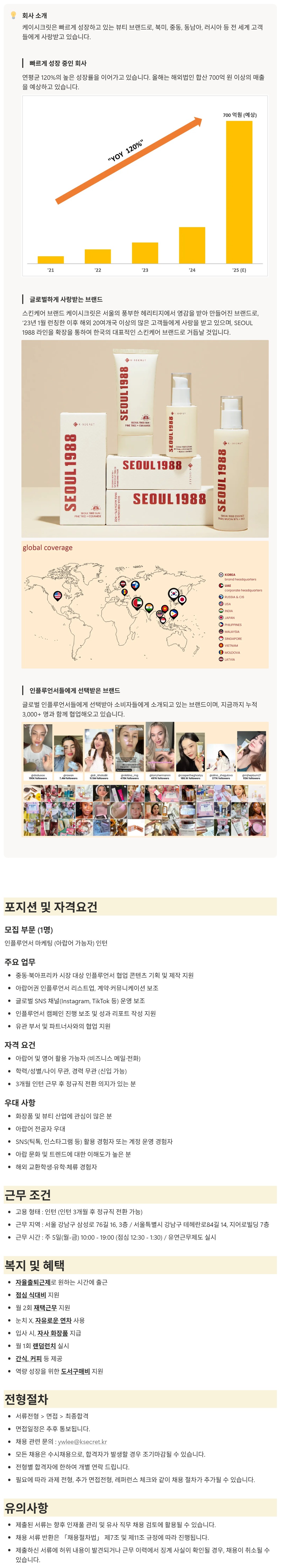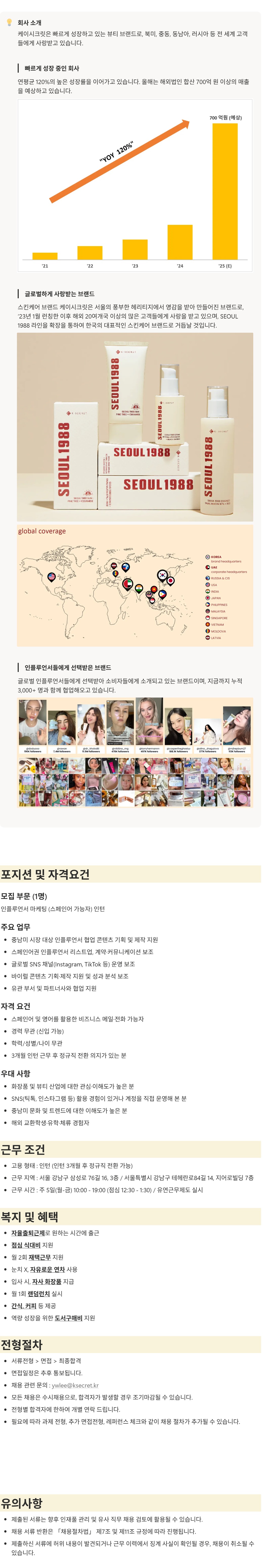 1. 케이시크릿 마케팅팀 인플루언서 마케팅 (스페인어 가능자) 인턴 채용