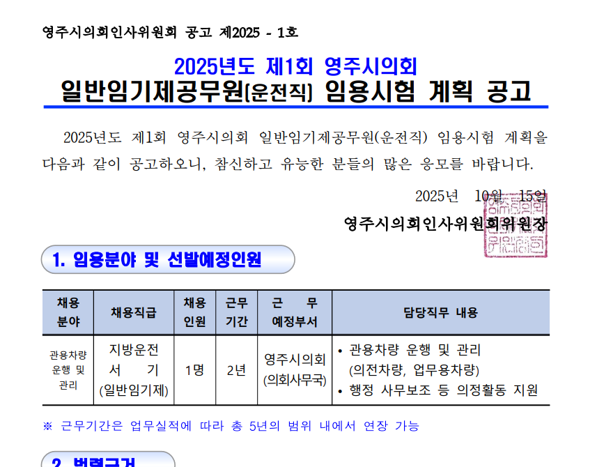 2025년 제1회 영주시의회 일반임기제공무원(운전직) 임용시험 계획 공고