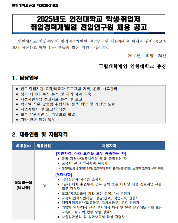 2025년 인천대학교 취업경력개발원 전임연구원 채용 공고 안내
