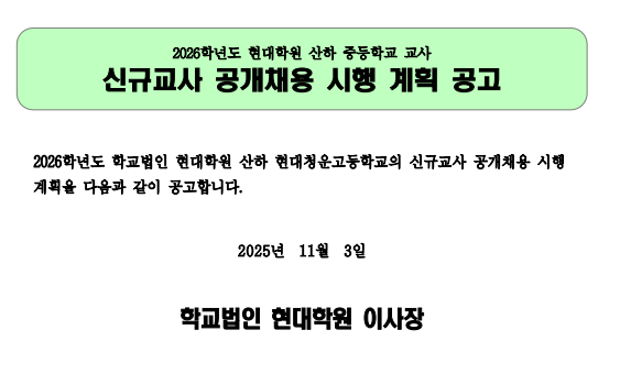 2026학년도 학교법인 현대학원(현대청운고등학교) 신규교사 공개채용