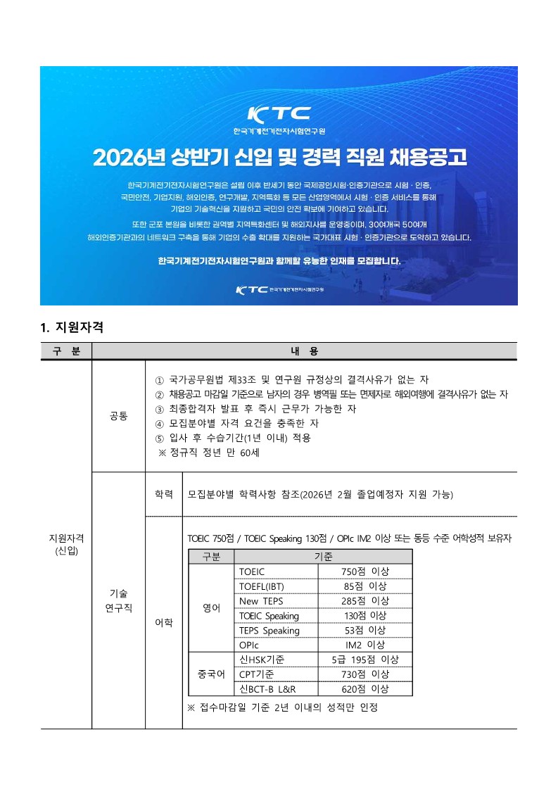 2026년 한국기계전기전자시험연구원 신입 및 경력 직원 채용 공고