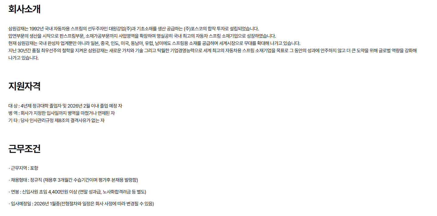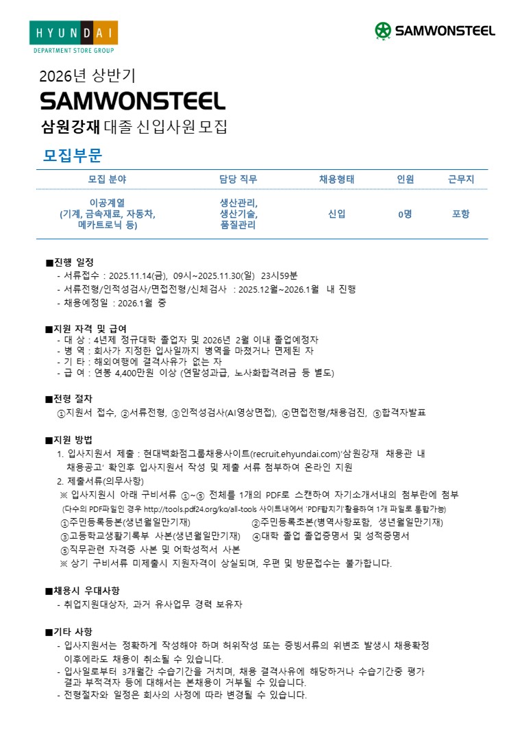 [삼원강재, 포항]2026년 상반기 신입사원 채용 (~11/30)