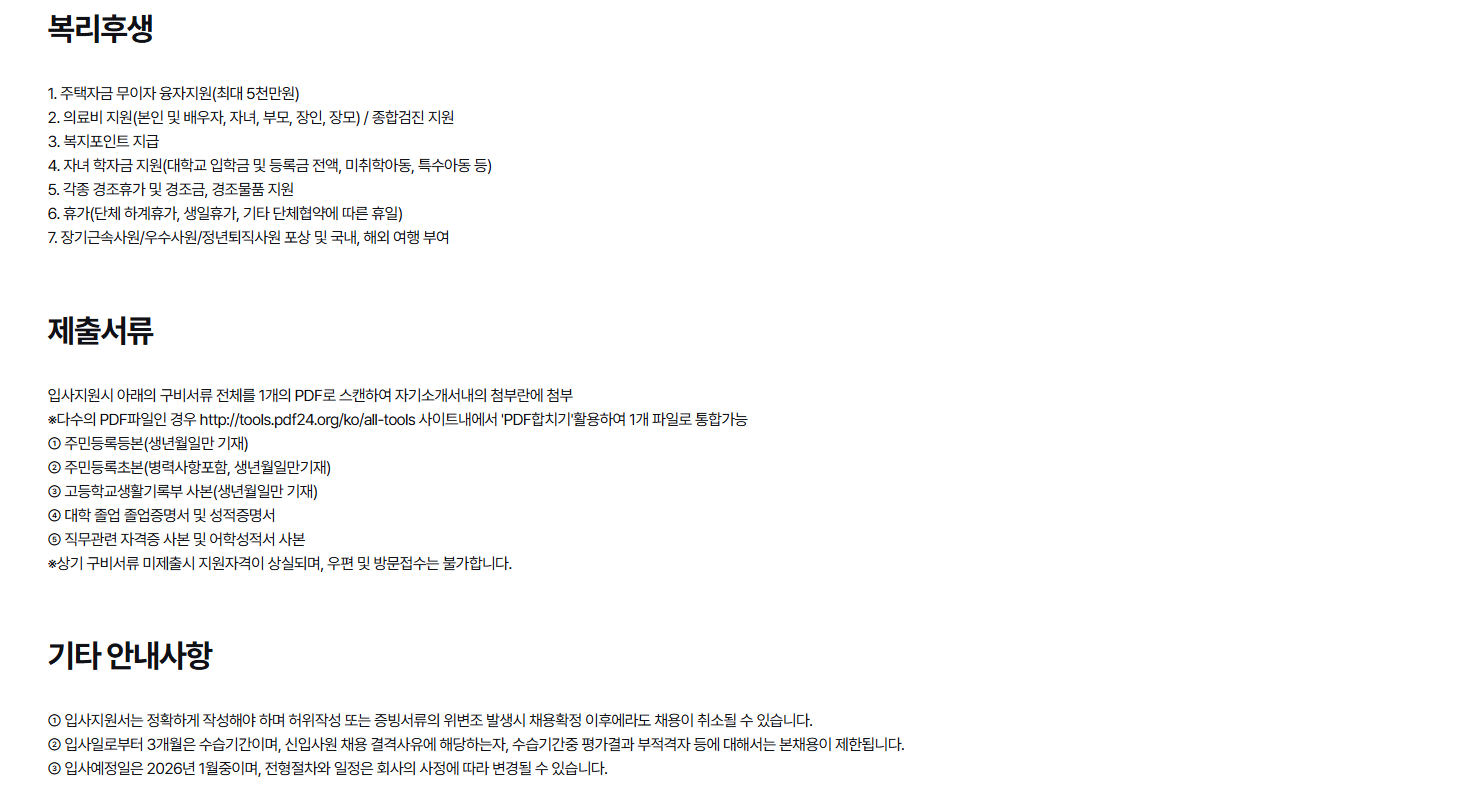 *복리후생 : 자녀 학자금 지원, 의료비 지원, 복지포인트 지급, 휴가비, 명절귀성비, 각종휴가 및 경조금 외