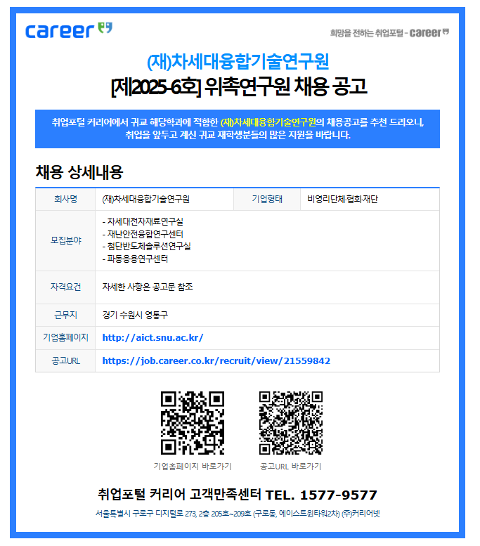 (재)차세대융합기술연구원 [제2025-6호] 위촉연구원 채용 공고(~12/08)