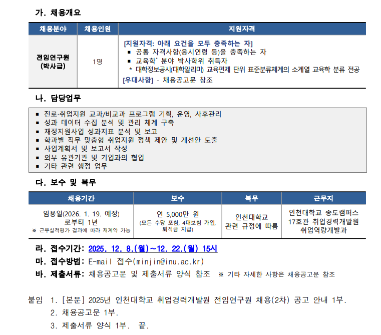 2025년 인천대학교 취업경력개발원 전임연구원 채용(2차)