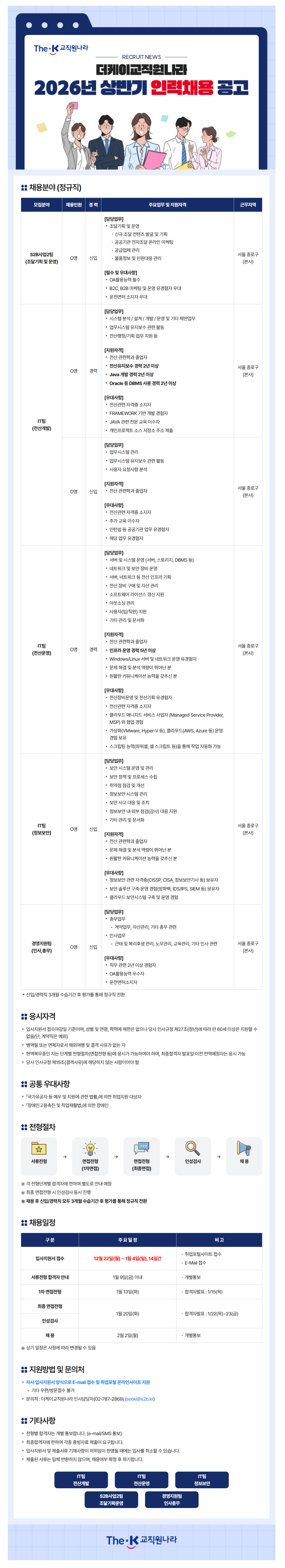 · 더케이교직원나라(주) 2026년 상반기 인력채용 공고 · 학력 : 대졸이상 · 마감일 : 2026.01.04 · URL : https://job.incruit.com/jobdb_info/jobpost.asp?job=2512190000885