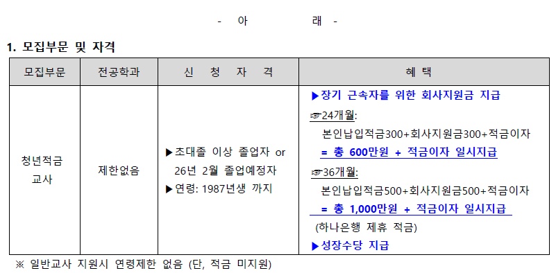 • 당사에서는 20~30대 젊은 교사의 유입을 증가 시키고자 아래 모집요강에 의거하여 귀 대학의 유능한인재를